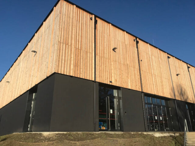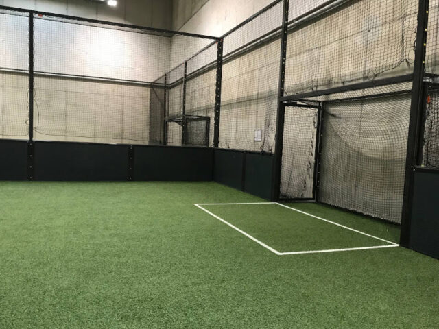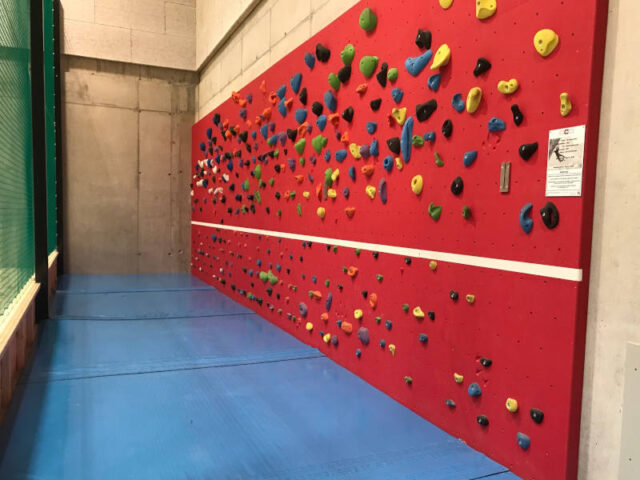 Gleich rechts wenn ihr in die Halle hineinkommt ist neben dem Tisch mit den Sportgeräten eine Boulderwand. Daran anschließend liegt das eingezäunte Beachvolleyballfeld. Ganz hinten am Rand sie die Kunstrasensoccerplätze, alle eingezäunt, damit die Bälle nicht in der ganzen Halle herumfliegen können.