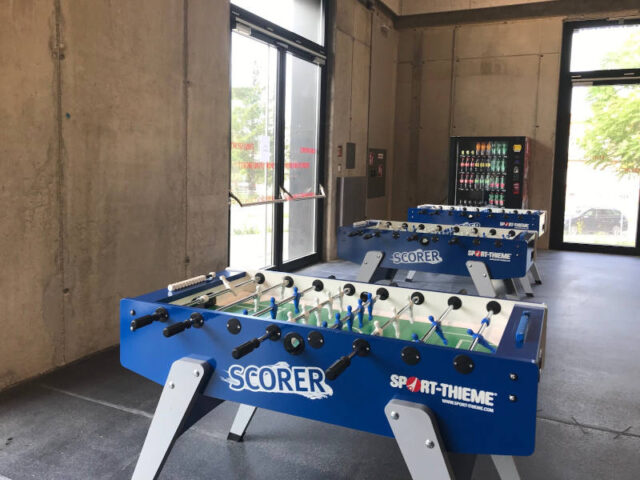 Natürlich gibt es dort auch Sanitäranlagen, Duschen und Umkleideräume. Ein kostenpflichtiger Getränkeautomat steht bei den Tischfußballtischen.