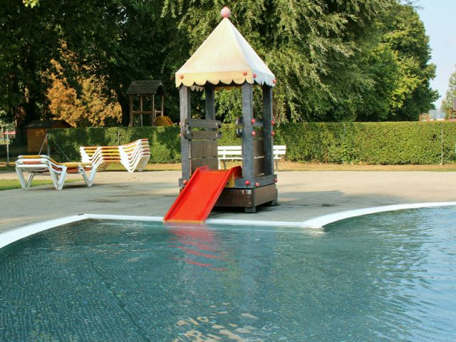 Wer Abwechslung vom Naturbaden sucht, kann im Kleinkinderbecken (Chlorwasser) mit einer Mini-Wasserrutsche und kleinen Wasserfontäne plantschen. Auch finden sich hier immer ein paar Liegen im Gras zum Verweilen.
