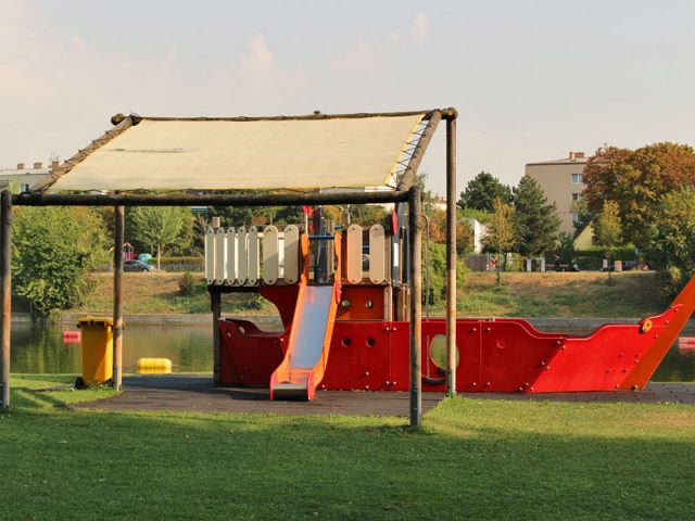Im Moment breiten wir unsere Picknickdecke gerne unter einem der Bäume parallel zum Ufer aus. Von dort aus habe ich sowohl die Sandkiste als auch den Spielplatz gut im Blick und meine Tochter kann sich auch einmal alleine auf Entdeckungstour begeben.