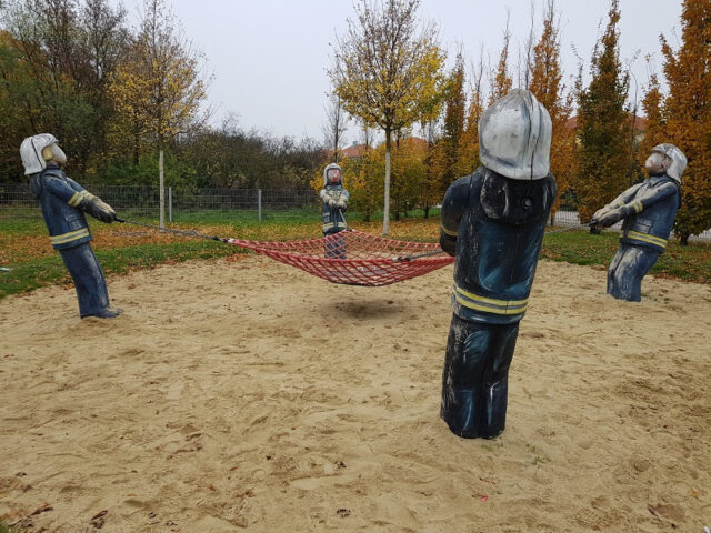 Über das Feuerwehrauto, inklusive ausgefahrener Drehleiter, geht es zum großen Rutschenturm hinüber. An der kurzen Rutsche am Fahrzeug haben auch die Kleineren ihren Spaß. Der mehrstöckige Turm bietet, neben einer langen Rutsche und einer Rutschstange, auch eine Kletterwand. Die Federwippe ist ein Feuerwehrauto für die Kleinsten.