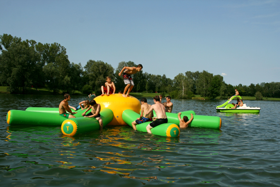 Das Tullner Aubad ist ein Teich mit einer Insel mitten drinnen und vielen Attraktionen für Kinder. Da gibt es einen großen Sandstrand, Rutschen, einen schönen Erlebnisbach mit Steinen – auf Zehen und Knie aufpassen! Für Kleinkinder gibt es ein Spielschiff, während sich größere Kinder am schwimmenden Oktopus oder auf den Stegen tummeln. Selbstverständlich gibt es auch einen Spielplatz und viel Wiesenfläche zum Ballspielen. Außerdem stehen Beach-Volleyballplätze, ein Beach-Handball- und ein Basketballplatz sowie Tischtennis-Tische bereit.