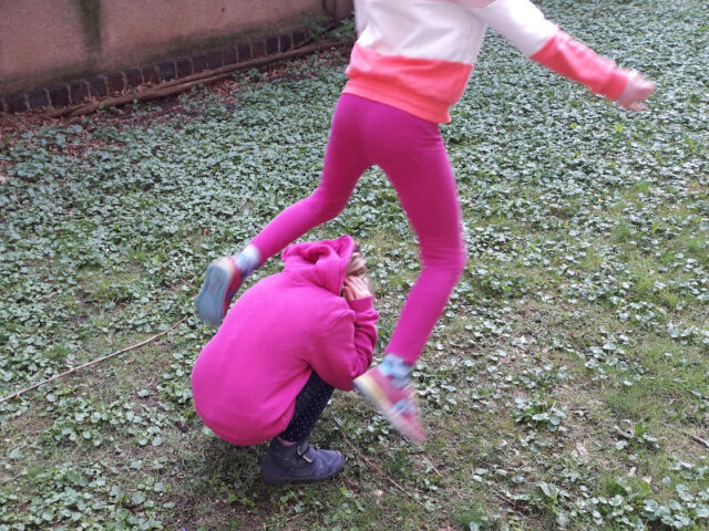 Das Seilspringen mit dem langen Seil ist vielen auch unter Seildrehen bekannt. Auch das könnt ihr unterschiedlich spielen. Meine Mädchen drehen nicht so gern, sondern springen viel lieber. Aus diesem Grund bin ich immer die Dreherin und das andere Ende befestigen wir meistens an einer Bank. Die Herausforderung als Dreher_in ist, den passenden Rhythmus für die Kinder zu finden. Damit das mit dem Rhythmus besser funktioniert, helfen Reime. Nun können die Kinder abwechselnd springen oder aber auch eine nach der anderen quasi durchlaufen bzw. springen oder auch gleichzeitig. Tipps für die richtige Seillänge und passende Reime haben wir im Blog auch beschrieben.