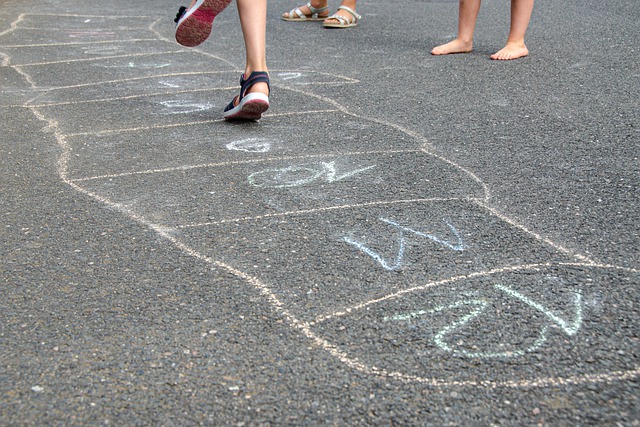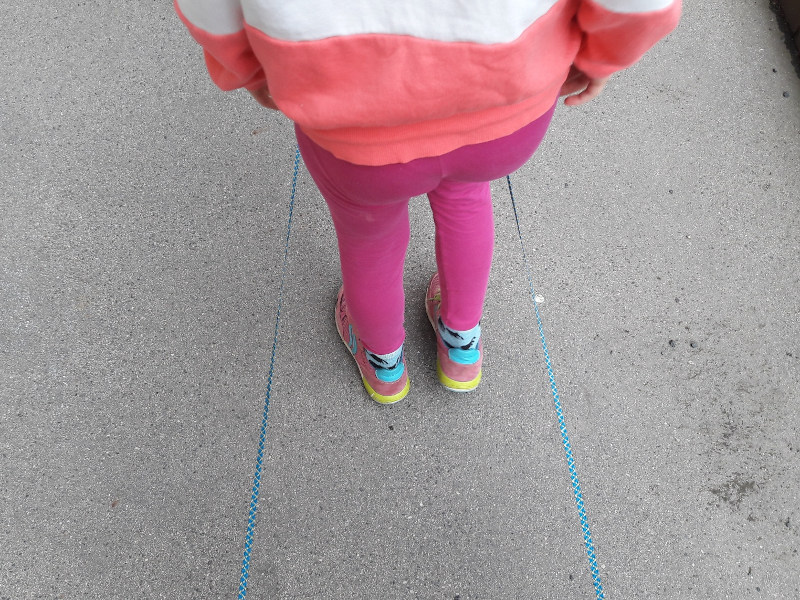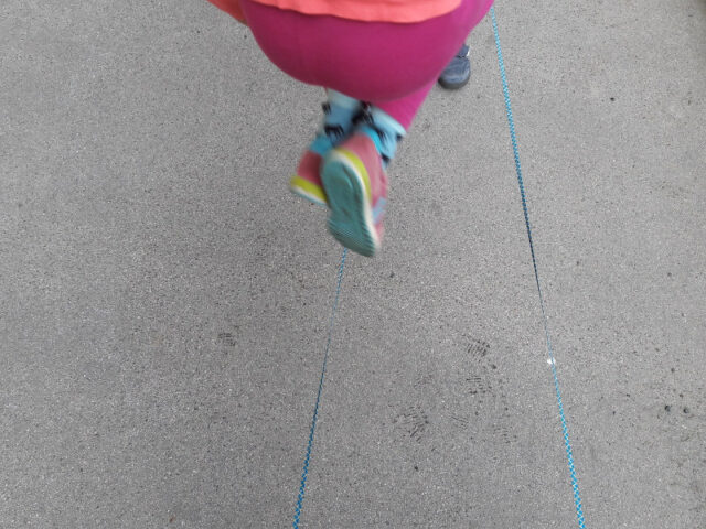 Ihr könnt mit Bodenkreiden einen kleinen Parkour aufzeichnen und losgeht’s. Wer noch keine zuhause hat, findet im Blog-Beitrag „Bewegungsparkour advanced“ eine Bauanleitung.