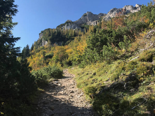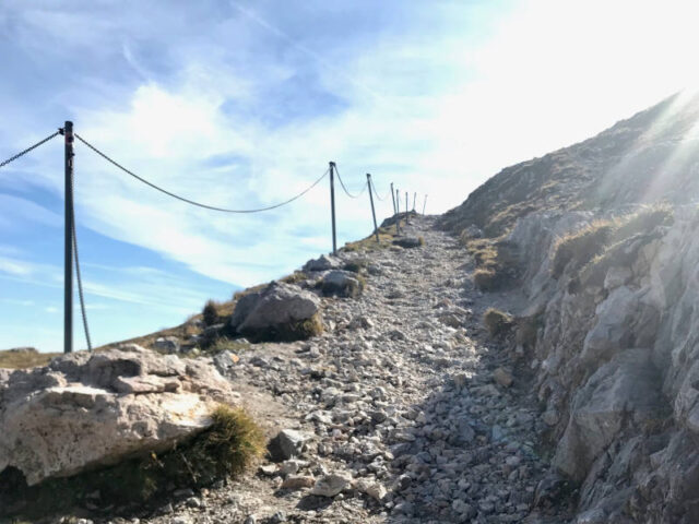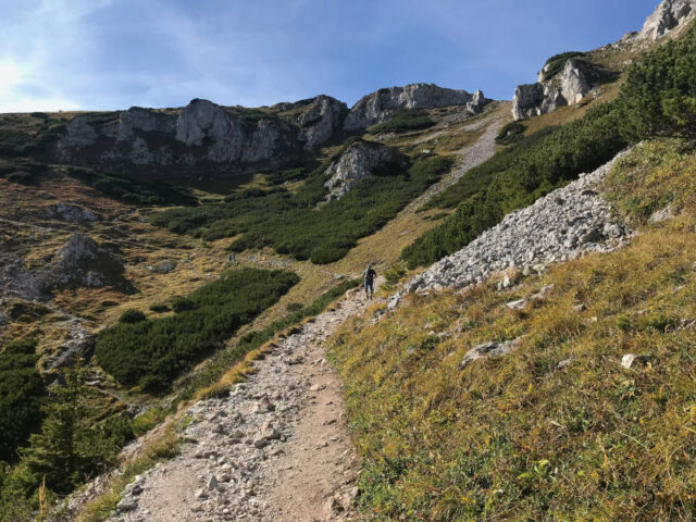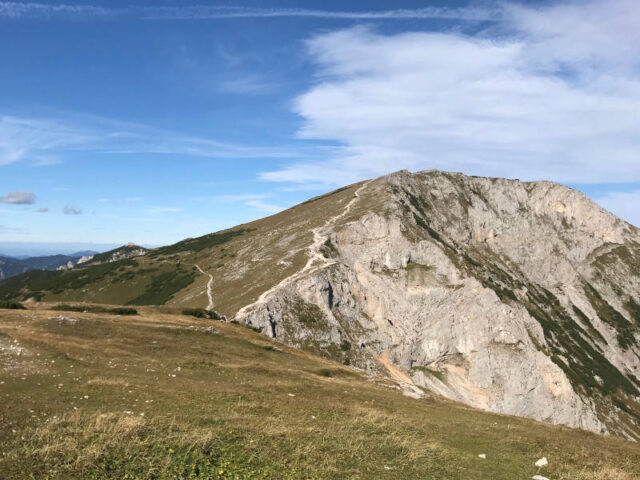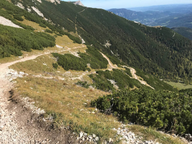 Vom Waxriegelhaus geht es erst sanft über Hochweiden dann etwas steiler durch Latschen den Schlangenweg hinauf. Der Weg wird hier schmaler und schlängelt sich durch den Sieben-Brunnen-Kessel in Serpentinen hinauf, wie eine Schlange. Herrliche Ausblicke belohnen für die Mühe des Aufstiegs. Eine mit Seil gesicherte Stelle am letzten Eckpunkt stellt noch eine Weiche dar: Ihr könnt entweder den steilen felsigen Weg nach oben wählen oder den Hang ein letztes Mal queren und durch eine Engstelle das Raxplateau erreichen. Von dort führt der Weg nach links über die Kuppe zum Karl Ludwig Haus auf 1804m Seehöhe. Auch diese Etappe ist mit einer Stunde angeschrieben.