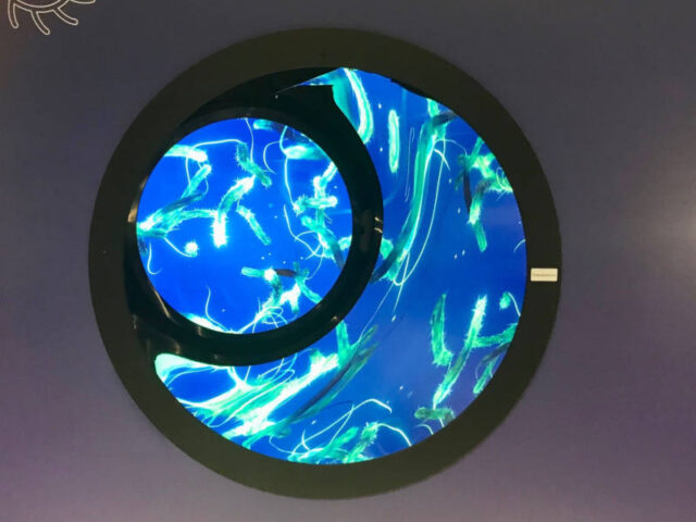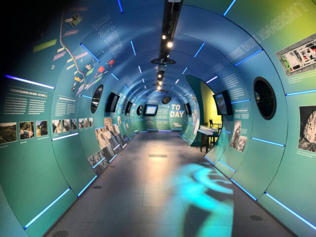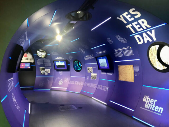 Das Ausstellungsgebäude ist wie ein großes Kanalrohr im 7m Durchmesser, wie jenes das beim Wiental Kanal verlegt wird. Hier werdet ihr aber nicht in grauen Röhren sondern in einem bunten ansprechenden Raum durch die Zeit geführt werdet. Diese Führung mit einer Stimme dauert 20 Minuten, es bleibt aber dann noch Zeit, euch genauer Umzuschauen und Vertiefendes nachzulesen.