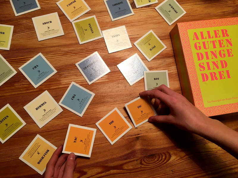 Auch hier muss man 3 zusammengehörende Begriffe finden. 3 passende, statt 2 Memorykarten, das erhöht den Schwierigkeitsgrad echt. Bei diesem Spiel gibt es leichte Sachen wie z. B. Toi-Toi-Toi oder Stadt-Land-Fluss aber auch Begriffe, wo man nachdenken muss rot-schwarz-? Oder vielleicht sogar Neues lernt z.B. Nepper-Schlepper-?