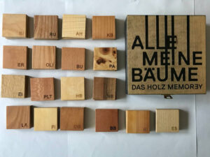 Und hier noch eine Ergänzung, weil wir das Spiel so toll fanden. Wir bekamen es geschenkt von jemandem, der es Second Hand günstig erwarb. Erst jetzt hab ich gesehen, dass es leider sehr teuer ist. Ihr könnt es aber bei der WIENXTRA-Spielebox testen, die haben es im Verleih. Uns gefällt es sehr gut. 18 verschiedenen Bäume lernt man dabei kennen, also eigentlich nur das Holz. Denn die Bäume wurden in kleine Holzstücke geschnitten, sodass man die Struktur gut sehen kann. Auf der anderen Seite sind sie alle schwarz bemalt. Wir finden, es ist kein einfaches Spiel, ganz im Gegenteil, da sich manche Holzarten sehr ähnlich sehen. Aber irgendwie ist es etwas Besonderes, ein Memory zu spielen, das die Natur vorgab.