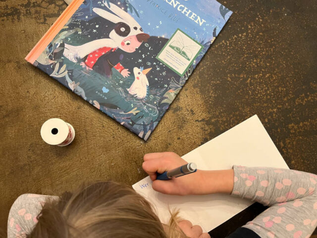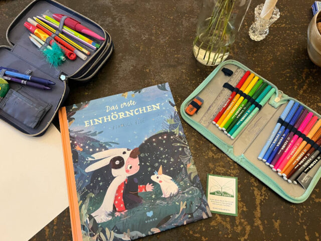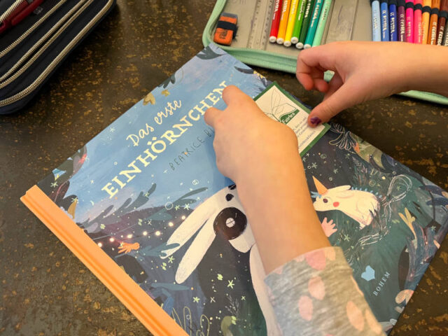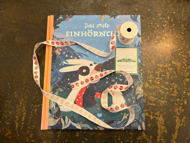 Zuerst braucht es ein Buch. Wir haben uns sehr schnell für „Das erste Einhörnchen“ von Beatrice Blue entschieden. Um klar zu machen, dass das Buch mitgenommen werden kann, haben wir einen Book Fairy Sticker aufgeklebt. Darauf steht „Nimm dieses Buch, lies es und hinterlasse es dann jemand anderem zum Genießen.“