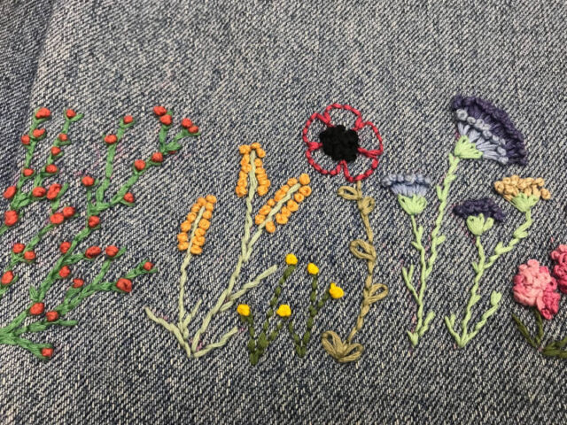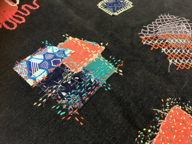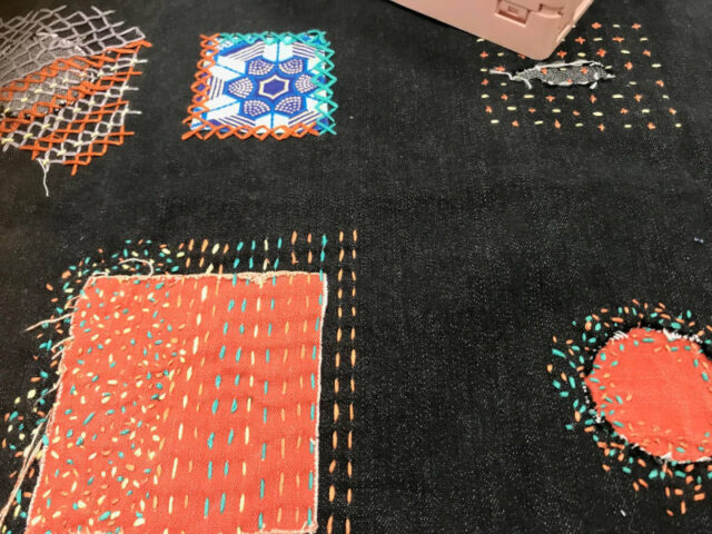 Schon die vielen Beispielteile machten Lust, selber etwas so Schönes zu gestalten. Doch zuerst ging es an die Basics. Auf einem kleinen Stoffteil wurden Linien gezogen und unterschiedliche Stiche geübt. Dann suchte man sich einen Faden passend zum Kleidungsstück und schon konnte es losgehen. Nebenbei wurde geplaudert und so manche merkte erst als die Zeit um war, wie versunken wir gearbeitet hatten. Ich ging mit bunt gestopften Socken und einem verzierten Pullover nachhause.