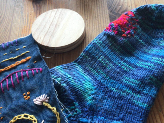 Bei all dem Überfluss finde ich es manchmal schön, an besonderen Stücken zu hängen, z. B. an den bunten Socken, die meine Mutter gestrickt hat. Dass ich sie im Winter so gern trage, sieht man an den Löchern, die mit der Zeit unvermeidbar sind. Zwar liebäugle ich mit allen möglichen Reparaturen und ganz besonders zu visible Mending, dem sichtbaren Reparieren von Kleidung. Da habe ich auch schon richtig schöne Beispiele im Internet gefunden, aber allein konnte ich mich nicht dazu aufraffen. Wie gut, dass es für Menschen wie mich Repair-Cafe’s gibt, denn zusammen macht es einfach mehr Spaß.
