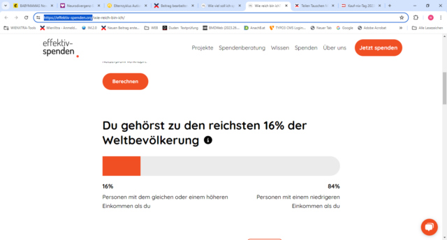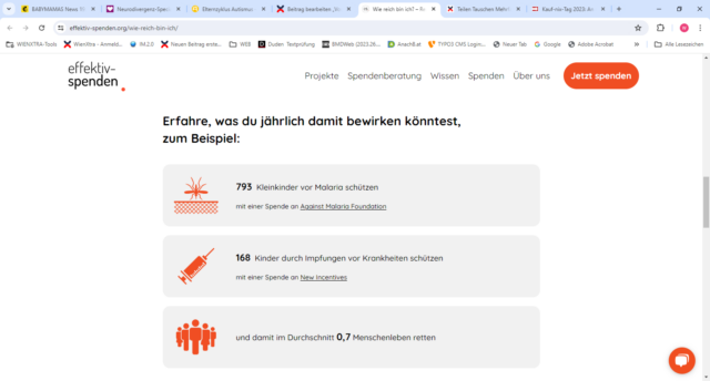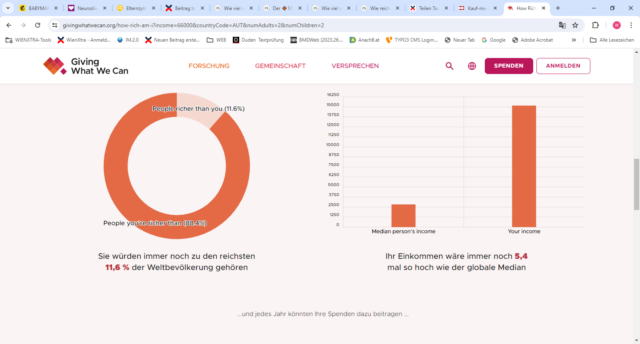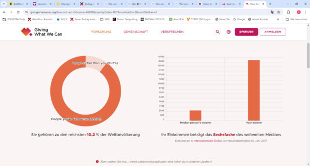 Noch weiter zu gehen und Geld zu spenden ist für viele Menschen ein kleiner Schritt, der immer wieder gegangen wird. Hier einen Euro, einen Zehner fürs Rote Kreuz vielleicht auch einen Hunderter für Menschen in Not. Und doch stehen dem Geld spenden viele auch skeptisch gegenüber. Dabei greift dann schnell das Gefühl, selber doch nicht genug zu haben. Da fand ich den Test „Wie reich bin ich eigentlich?“ von effektiv-spenden.org oder auch den von Giving what we can sehr hilfreich.