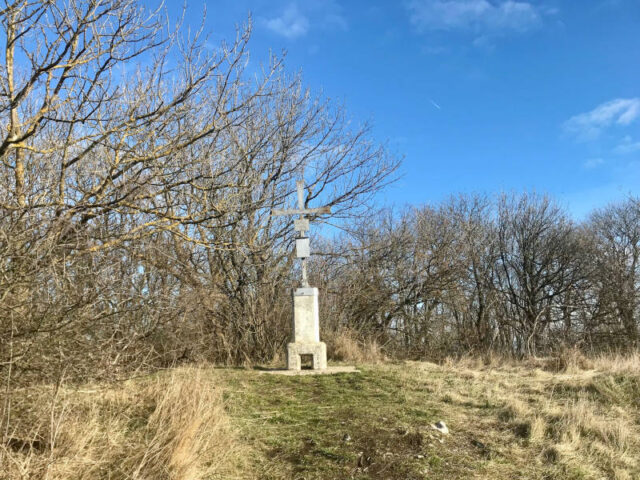 Das unscheinbare Gipfelkreuz am Hundsheimer Berg ist ein paar Meter weiter. Zuerst führt uns der Weg noch am Plateau entlang und dann über den Hexenberg hinunter in Richtung Hundsheim. Der Steig durch den Wald ist hier recht steil und geht beinahe gerade hinunter. Ab und zu säumen ein paar kleine Naturlehrpfadtafeln den Weg.