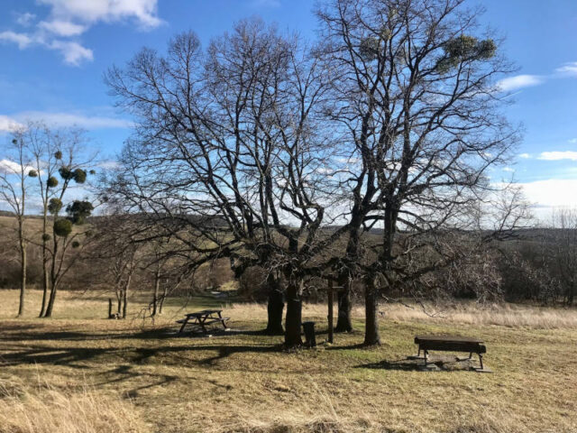 Nach einer guten halben Stunden erreichen wir bei Hundsheim einen schönen Rastplatz unter großen Bäumen. Der Rundwanderweg führt dann mehr oder weniger flach Richtung Sportplatz Hundsheim weiter. Nach einer Viertelstunde erreichen wir erst die Abzweigung zum Zwergenloch und dann die Güntherhöhle. Die Vegetation auf dieser Seite des Berges ist kahler und immer wieder kommen wir an schönen Wachholdersträuchen vorbei.
