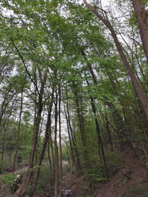 Es ist ein Waldweg mit Steinen, der ganz hinauf auf den Cobenzl bzw. auf den Himmel führt. Wandert vorbei an den Weingärten und auf der linken Seite sehr ihr einen Fluss. Es gibt keine Abzäunung. Zu Beginn des Weges gibt es zwei Bänke. Dort sitzen ein paar Mamas mit Kinderwagen, die nur auf dem ersten Teil des Spazier- bzw. Wanderweges bleiben. Wenn man die Weingärtenzone verlässt, kommt man in den Wald. Dort könnt ihr zahlreiche Pausen auf dem Waldboden bzw. auf Baumstümpfen einlegen.