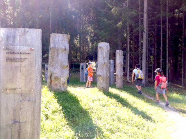 Der Weg biegt fast sofort in den Wald ein und führt über ein paar Treppenstufen durch die Gedenkstätte. An der Kapelle mit Trinkbrunnen folgen wir dem Forstweg nach rechts oben. Wir bleiben auf diesem Weg, bis nach zweimaligem Überqueren der Gleise der Waldstraßenbahn auf der rechten Seite das Baumhoroskop auftaucht. Auf den Stelen, die hier im Kreis aufgestellt sind, können größere Kinder nachlesen, welche Bäume ihrem Sternzeichen entsprechen, und etwas über sie erfahren.