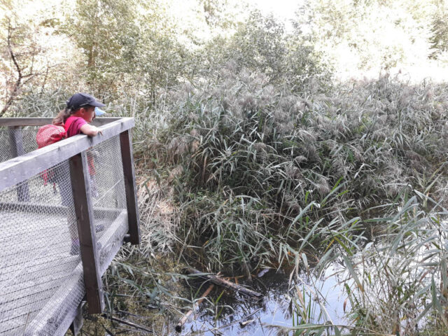 Ab hier geht es für etwa zehn Minuten durch den Wald am Rand des Moores entlang. Bei der nächsten großen Wegkreuzung stoßen wir auf eine Station des Trimm-dich-Pfads und biegen scharf links ab. Geradeaus sind einzelne Spielgeräte des Waldspielplatzes bereits zu sehen. Es lohnt sich jedoch, die Moorrunde zu Ende zu gehen, denn jetzt geht es über Stege und Brücken direkt durch Schilf und Moorlandschaft. Im Schilf lassen sich auch Vögel beobachten – ein Fernglas ist also nicht verkehrt.