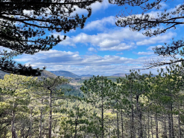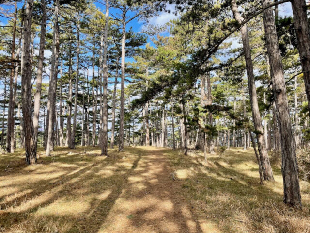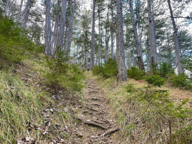 Danach geht es schon bald wieder flacher auf schönen Wegen durch den Föhren- und Laubwald. Mal wandern wir auf Waldwegen sanft aufwärts dann wieder abwärts, mal sind es nur Pfade, aber immer wieder müssen wir nachschauen, ob wir eh noch am rechten Weg sind.