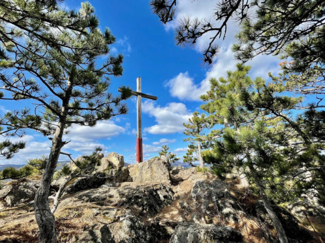 Bevor es auf den Größenberg hinaufgeht, schließt ihr die zweite Runde und wandert am Fuße des Zimsesbergs entlang. Die letzte Steigung führt wieder auf einem schmalen Pfad durch lichten Föhrenwald steil hinauf bevor ein Gipfelkreuz zu einer Rast einlädt. Das Kreuz steht auf Felsen und bietet eine wunderbare Aussicht auf die Hohe Wand und den Schneeberg. Nach etwas mehr als 2 Stunden haben wir hier die Pause in der Sonne genossen und uns gestärkt.