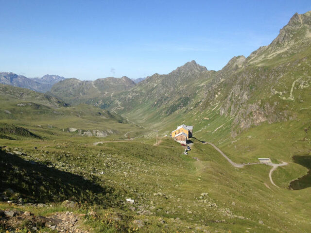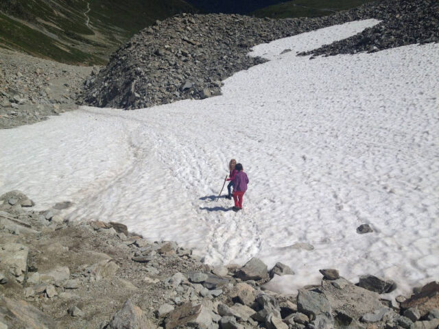 Am nächsten Tag ging es erst rauf, dann runter ins Ochsental, wo wir an einem Bach Rast gemacht haben. Dann gab es wieder einen steilen, aber nicht sehr langen Aufstieg hinauf aufs Muttenjoch auf 2620 m, dem höchsten Punkt der Tour. Über Geröllfelder mit einzelnen Schneefeldern ging es dann hinunter zur Friedrichshafner Hütte auf 2.138 m. Auch dort ist ein kleiner Teich und es soll sogar ein Schlauchboot geben, aber das haben wir nicht gesehen. Übrigens sind beide Hütten Teil der Kampagne Mit Kindern auf Hütten, eine Initiative der Alpenvereine in Deutschland, Österreich und Südtirol für familienfreundliche Hütten.
